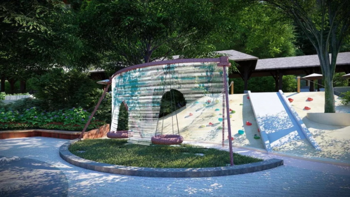 園路設計呈曲線型,各泡池空間可用小橋、木質廊道、小廣場等方式穿插連接,或曲或伸,忽寬忽窄,讓孩子去探究環境、體會不同形態和功能的泡池,滿足兒童好奇心理。
